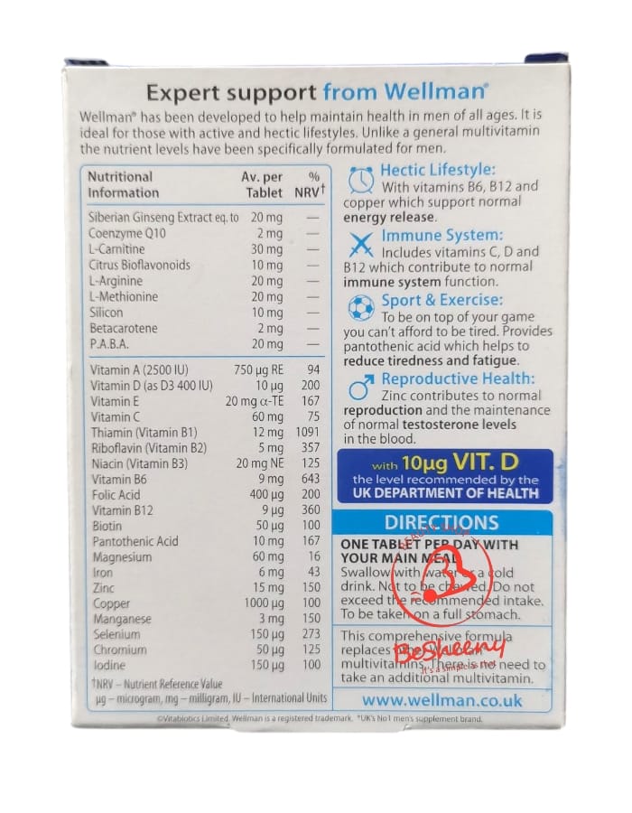ويلمان حبوب لصحة الرجال Wellman Original. هو المكمل الغذائى الأشهر فى بريطانيا تم تطويره من شركة فيتابيوتكس الانجليزية للمساهمة في تعزيز الصحة العامة وتقويتها لدى الرجال. كما يحتوى على العديد من المعادن والفيتامينات الأساسية التي يحتاجها الرجال بشكل يومي للحصول على الدعم الصحي المناسب. كما تأتي تركيبة Wellman Original بـ 29 مادة مغذية مخصصة للرجال من جميع الأعمار. مما يجعله مناسب لتلبية احتياجات الرجال الخاصة. كما أن حبوب فيتامين ويلمان اورجينال قد تتضمن مجموعة من الخصائص منها المساهمة في تحسين الصحة العامة كذلك زيادة الطاقة ودعم الجهاز المناعي. فضلاعن الحفاظ على الصحة العقلية.