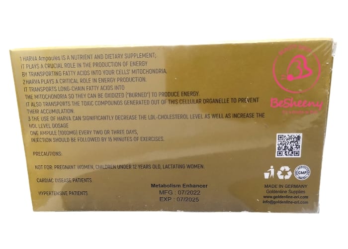 هارفا جولد أمبول التخسيس – Harva 10 Ampoule. واحدة من أقوى الأمبولات العضلية لرفع حرق الدهون بالجسم. حيث تسهم بشكل كبير في إزالة الدهون من الجسم. كما تساعد فى التخلص من الدهون الموجودة في مناطق مختلفة من الجسم مثل البطن والارداف والدراعات والساقين والظهر. ذلك بتفتيت الدهون وتحويلها لمواد سائله يسهل إخراجها من الجسم.
